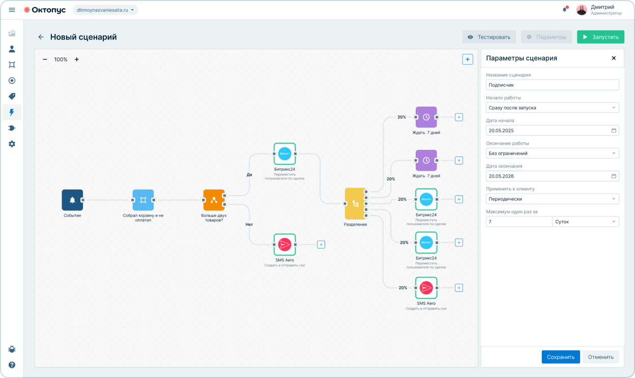 Сценарии позволяют задавать последовательность шагов и запускать коммуникации без ручного участия, сохраняя контроль над процессом.