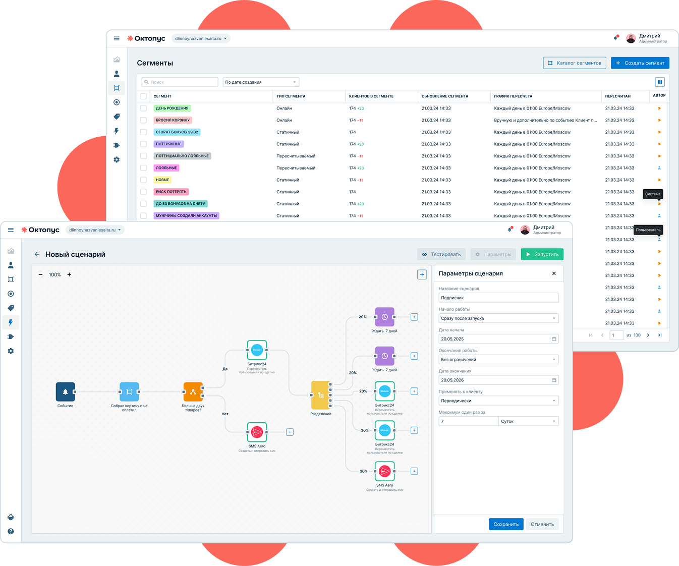 Используйте готовые шаблоны или настраивайте собственную логику сегментации, включая RFM-анализ и сложные условия.