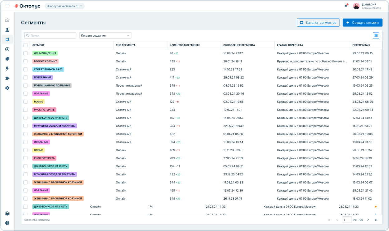 Создавайте сегменты по поведению, заказам и характеристикам клиентов.
